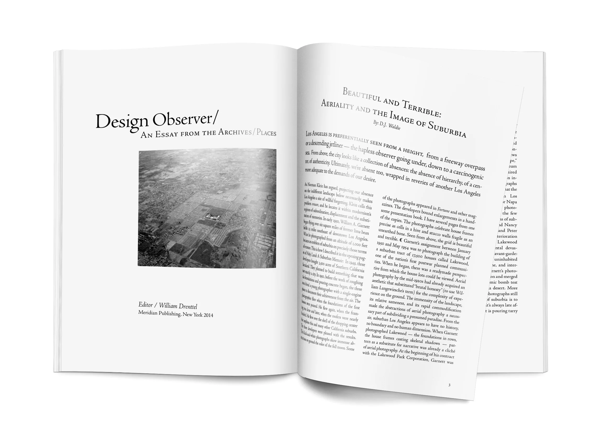 An editorial layout inspired by an article published in Design Observer. This specific article is named Beautiful and Terrible: Aeriality and the Image of Suburbia by D.J. Waldie.